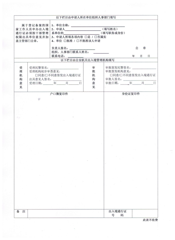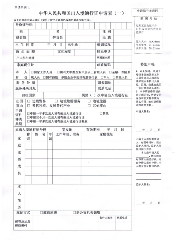 (一) 近期免冠照片一张以及填写完整的《中华人民共和国出入境通行证申请表(一)》(以下简称申请表);