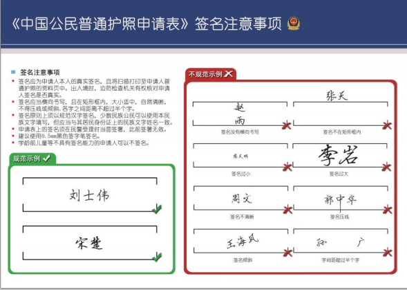 签名应当横向书写,且须在《中国公民普通护照申请表》指定的矩形框内,不得压线或倾斜,各字之间距离不超过半个字。